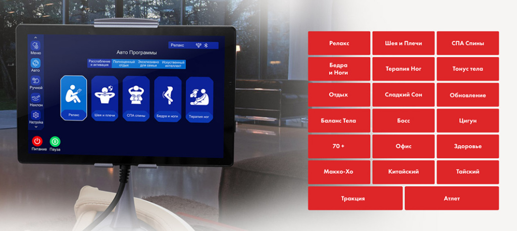 Кресло оборудовано 8-дюймовым цветным LED-экраном с сенсорным управлением, высокой четкостью изображения и полностью русифицированным интерфейсом.